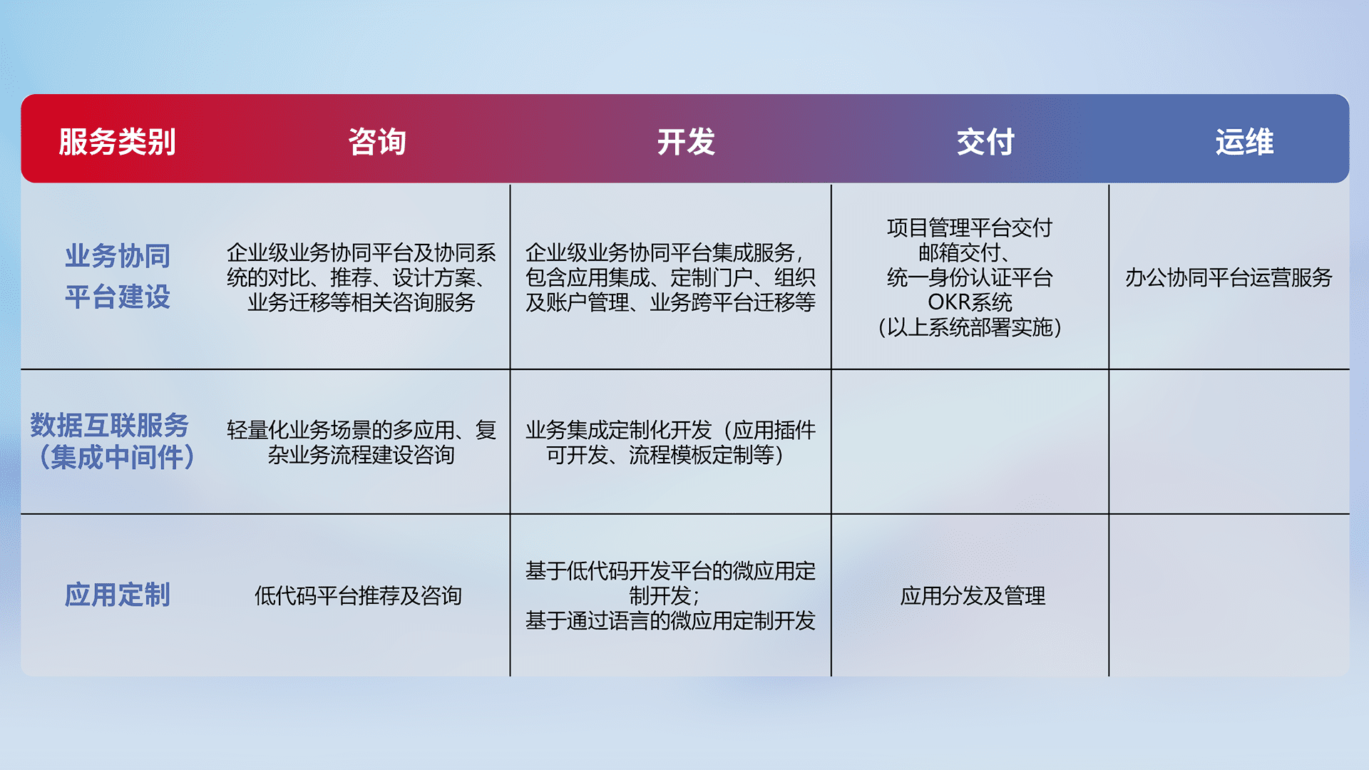 针对钉钉、、企微、、、IDaas等平台级产品提供产品的规划、、方案、、交付、、定制化开发等服务,,,,实现如统一协同办公、、智能客户服务、、、混合会议管理、、、、智能数据查询、、、等业务场景,,实现数字化转型。。。